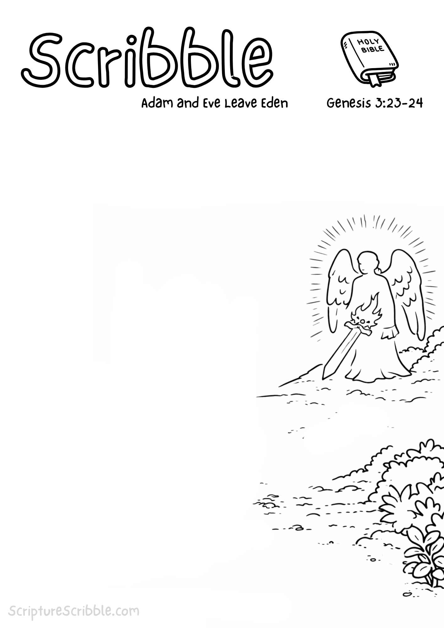 A printable devotional drawing page inspired by Genesis 3:23–24, inviting reflection through drawing the moment Adam and Eve leave Eden.