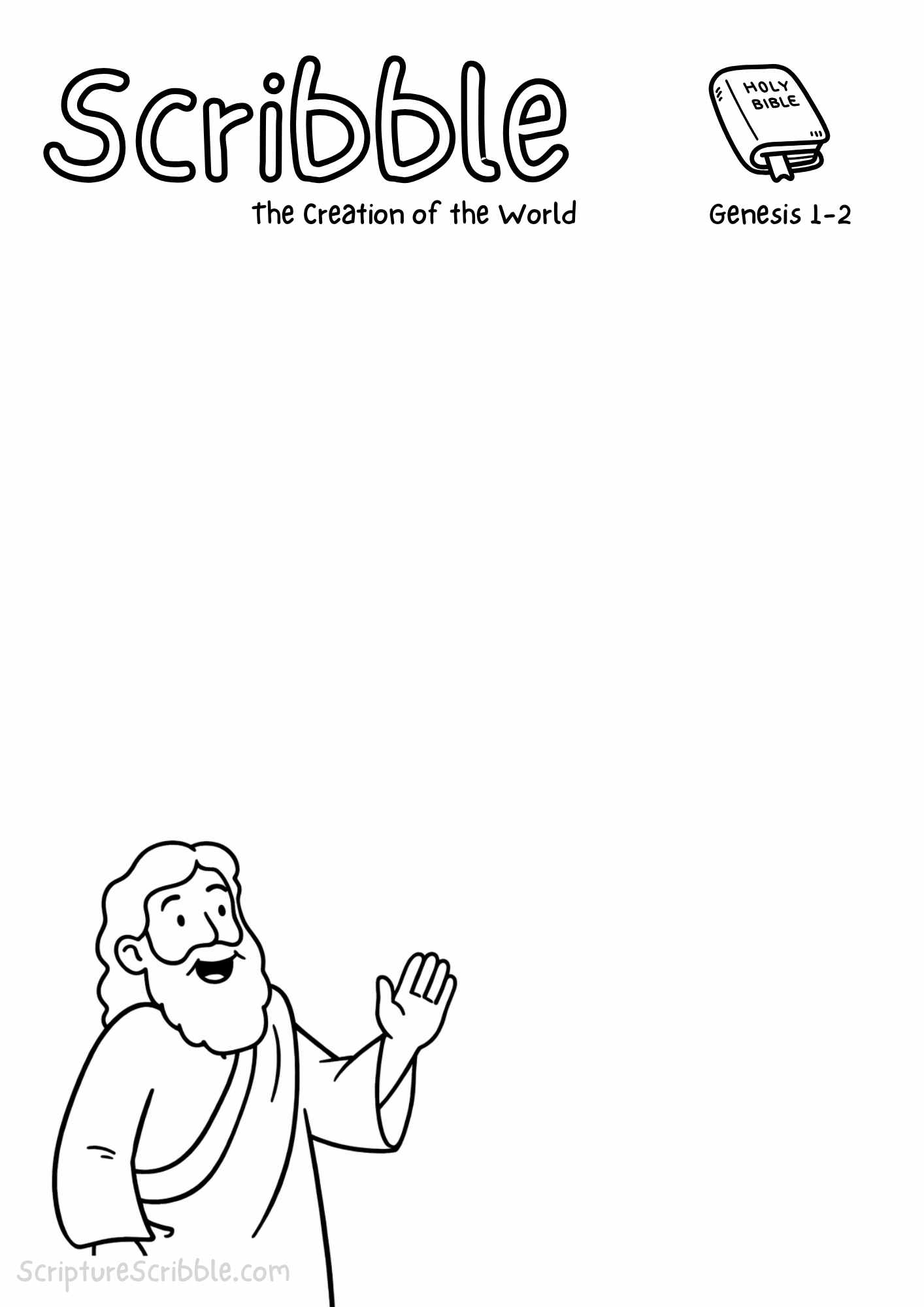 The illustration shows God with one hand raised, as if speaking or blessing creation. His expression is calm and welcoming, suggesting the act of creation through His word. Everything else—the light, sky, land, plants, animals, and the world itself—is intentionally left blank for the user to draw.