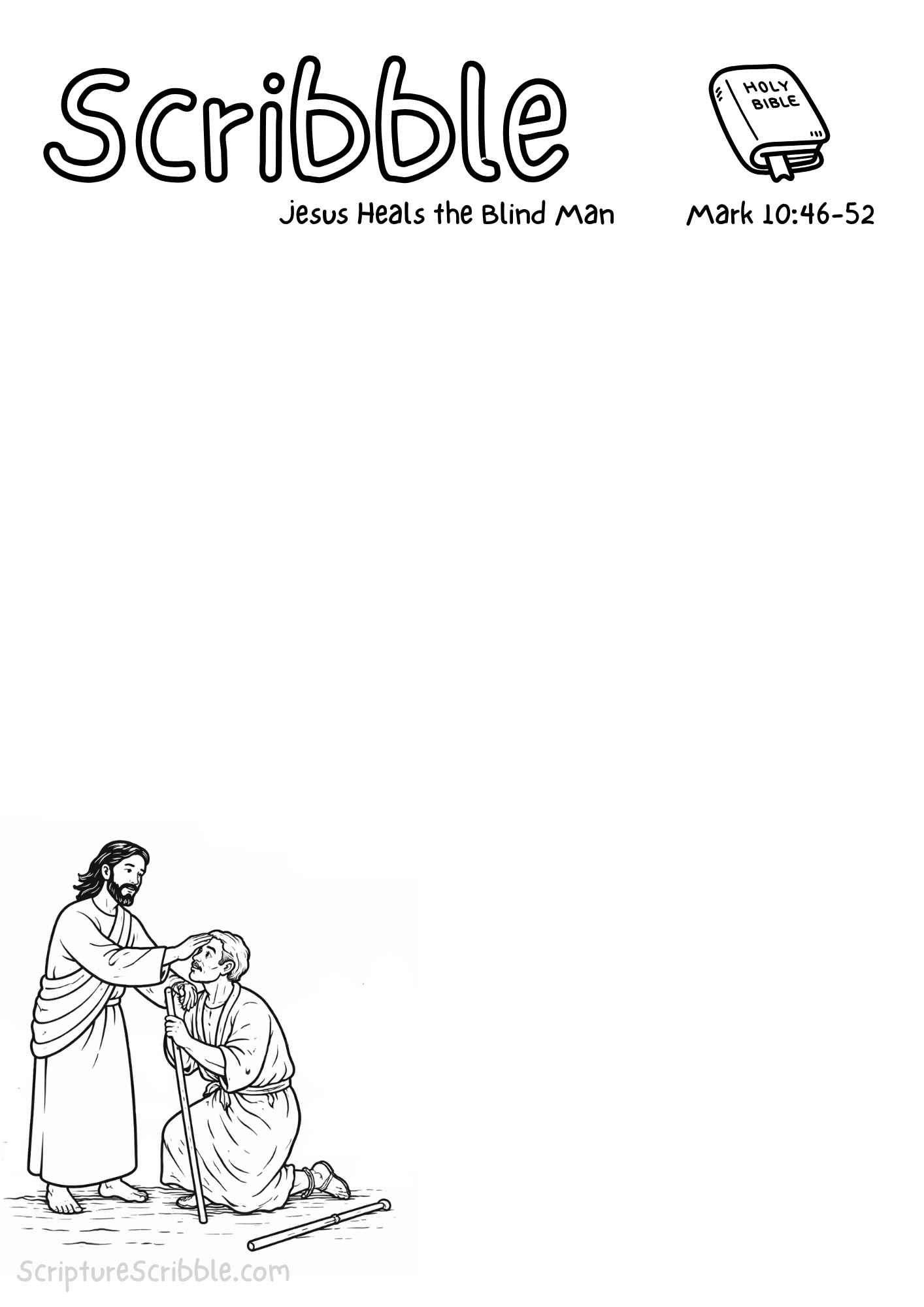 This devotional drawing page is based on Mark 10:46–52 and captures the moment Jesus restores sight to a blind man who cries out in faith. The page invites the user to draw the rest of the scene while reflecting on persistence, mercy, and healing.